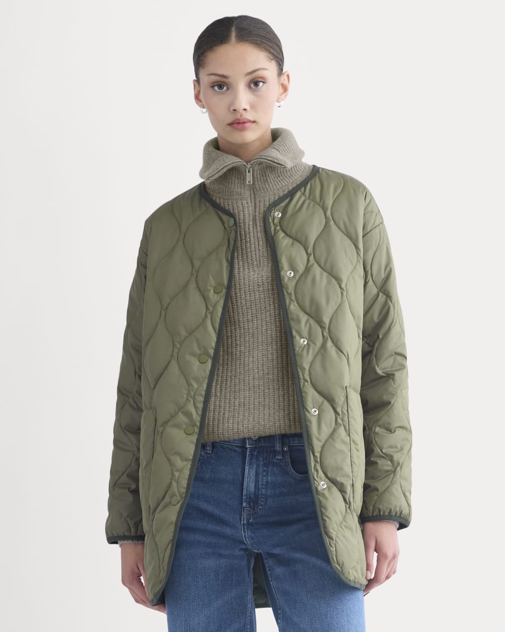 We took our favorite military-inspired liner and made it shorter for easy layering. Made entirely from 100% recycled polyester*. The Quilted Liner is lightweight. packable. and perfect for easy cold-weather layering. Plus. it features a classic crew neckline. snap fastening. handy side pockets. and a quilted design. Wear it as a standalone jacket or layer it under a coat for extra warmth without the weight. *Some of the snaps and trim aren't 100% recycled. but we're working on it. We've eliminated 90% of the virgin plastic from our supply chain. Learn about what we've done—and the challenges ahead—on our No New Plastic page.